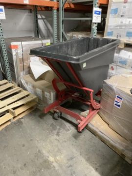 Rubbermaid dumping portable hopper. HIT# 2439734. Right warehouse with low ceiling. Asset Located at 13 Edison St., Amityville, NY 11701.