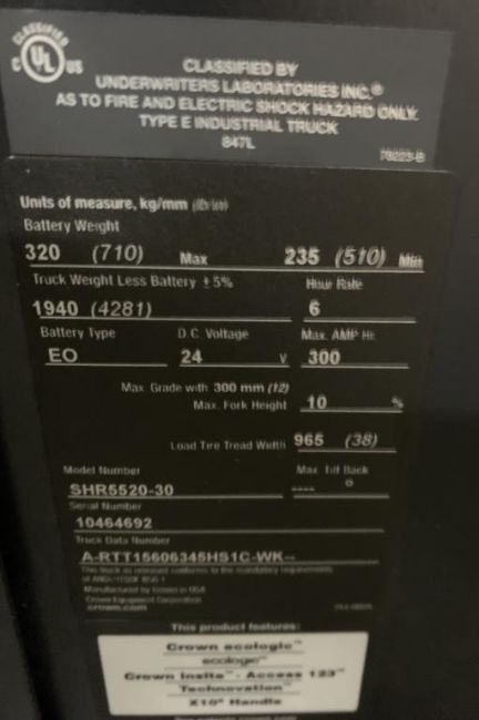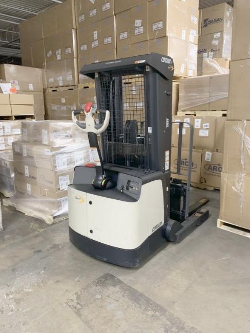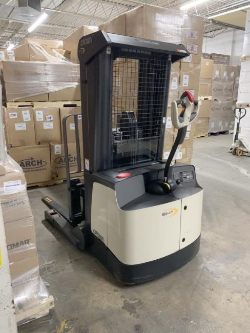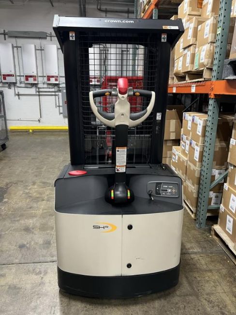 Crown Walk Behind Electric Forklift, Model SHR5520-30, SN 10464692. HIT# 2439735. Right warehouse with low ceiling. Asset Located at 13 Edison St., Amityville, NY 11701.