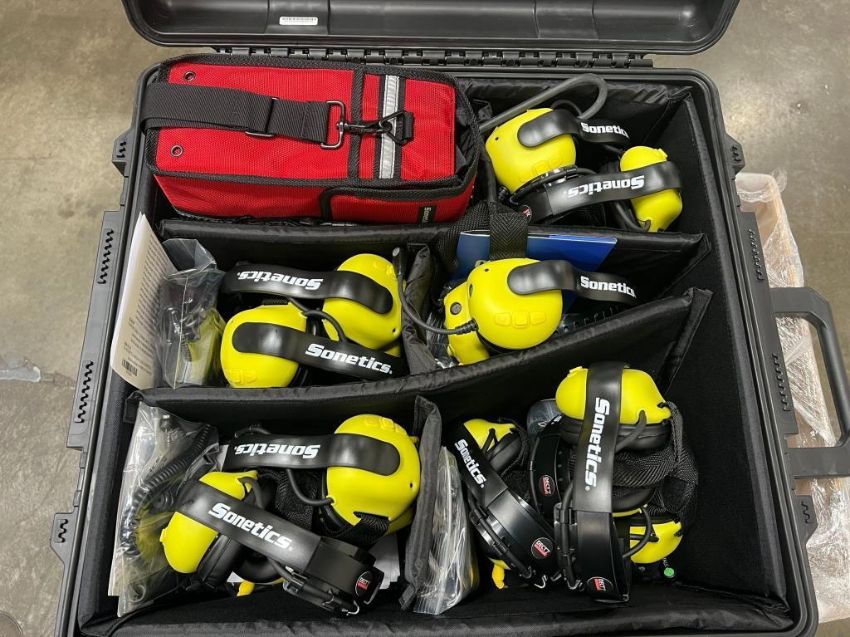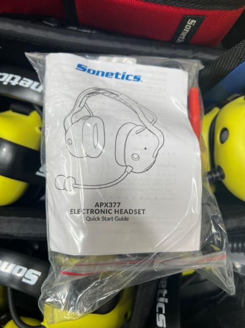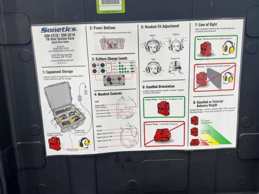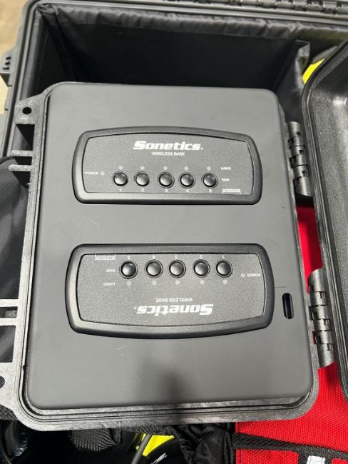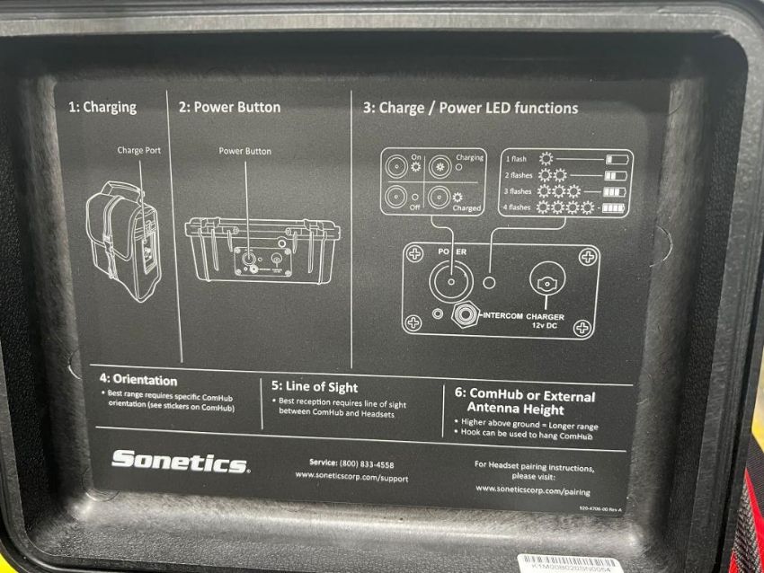 Sonetics wireless communication system consisting of APEX headsets and shown, Comhub and charging case. HIT# 2443645. Row. 6A. Asset located at 26545 Danti Court, Hayward, CA 94545.