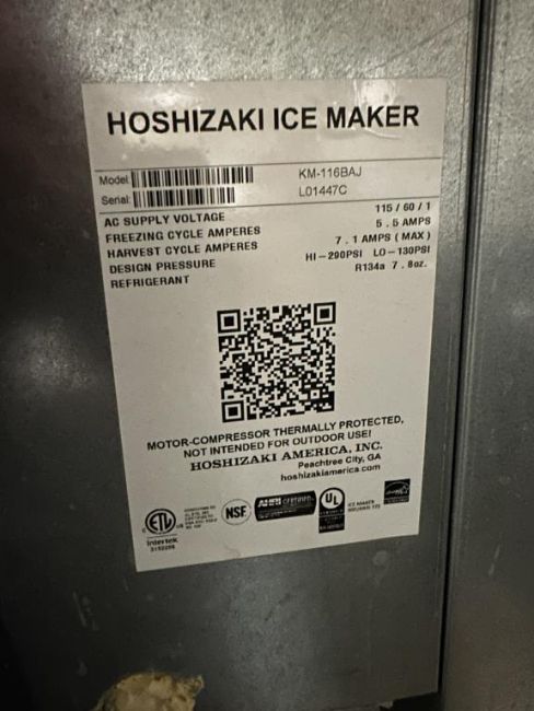 Hoshizaki KM-116BAJ Crescent Cuber Ice Maker, 115v. S/n#L01447C. HIT# 2460993. Loc: Front Warehouse. Asset Located at 4710 W Ledbetter Drive, Dallas, TX 75236.