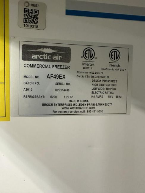 Arctic Air AF49EX 54" two section, 49 cu. ft. Reach-in Freezer, 115v. S/n#H20114480. HIT# 2460859. Loc: Front Warehouse. Asset Located at 4710 W Ledbetter Drive, Dallas, TX 75236.
