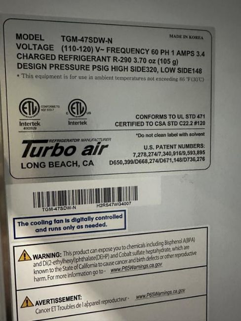 Turbo Air TGM-47SDW-N 2-Glass Swing Door Merchandiser Refrigerator, 115v. S/n#H2RS47WG4007. HIT# 2460931. Loc: Front Warehouse. Asset Located at 4710 W Ledbetter Drive, Dallas, TX 75236.