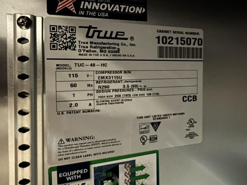 True Mfg. TUC-48-HC 48", 2-Section Undercounter Refrigerator, 115v. S/n#10215070. HIT# 2461012. Loc: Front Warehouse. Asset Located at 4710 W Ledbetter Drive, Dallas, TX 75236.