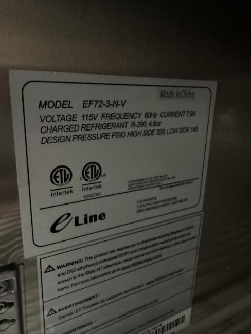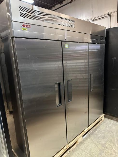 Eline EF72-3-N-V 78" Three Section Reach In Refrigerator, 65.8 Cubic Ft. Capacity, 115v, NOTE: Door Broken. HIT# 2460967. Loc: Front Warehouse. Asset Located at 4710 W Ledbetter Drive, Dallas, TX 75236.