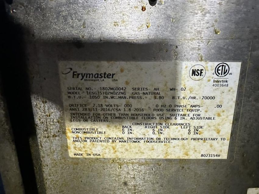 Frymaster 1ESG35T0ZN0ZZNG Gas Deep Fryer. S/n#1802MG0042. HIT# 2461034. Loc: Rear Warehouse. Asset Located at 4710 W Ledbetter Drive, Dallas, TX 75236.