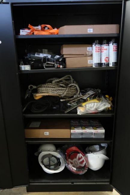 2-Door Cabinet with Contents of PPE, 36" x 18" x 72" Cabinet & Contents of Ladder Leashes, Nylon Ropes, Shock Absorber Lanyards, Hard Hats, Emergency Eyewash Kits, & Fire Extinguishers. HIT# 2494851. Asset Located at 50 Graham Place - Unit 3, Southington, CT 06489.