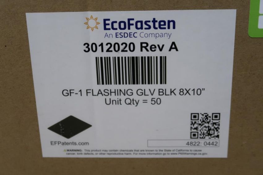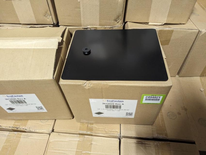 EcoFasten 3012020 REV A Lot: (33) Boxes of 8" x 10" Black GF-1 Flashing Grommets, (50) Flashing Grommets per Box. HIT# 2494821. Asset Located at 220 Barber Ave., Worcester, MA 01606.