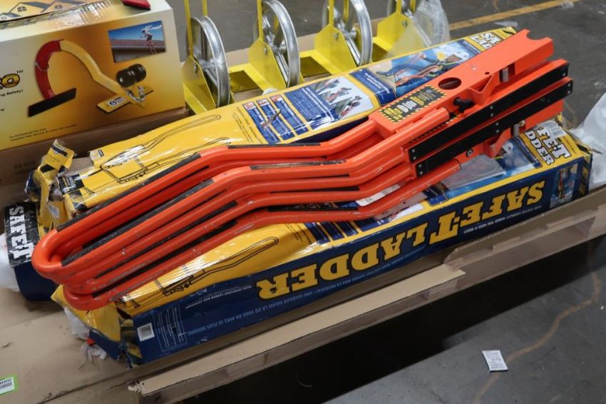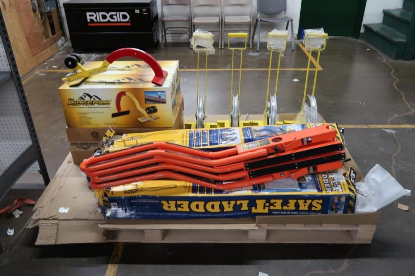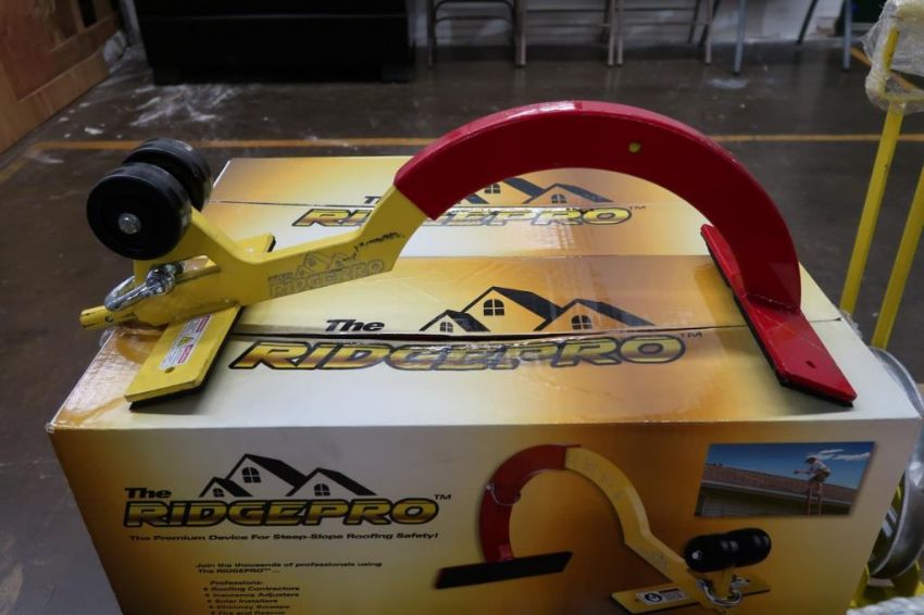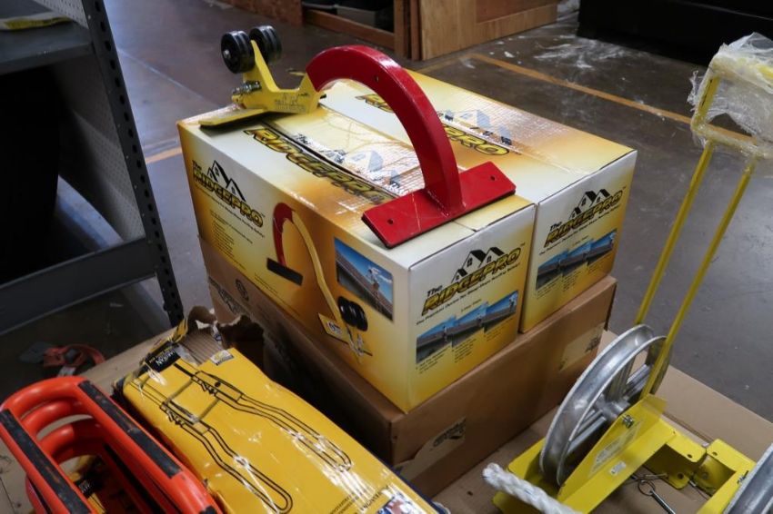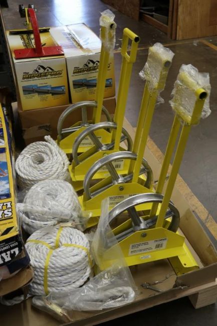 Pallet of Roofing Safety Accessories to Include (4) Ridgepro Ridge Climbing Supports, (5) Sets of Safe-T Ladder Rail Extensions, (4) Tie Down Long Handle Hoisting Wheels with 12" Wheels, & (3) Nylon Ropes with Latch Hooks. HIT# 2494850. Asset Located at 50 Graham Place - Unit 3, Southington, CT 06489.