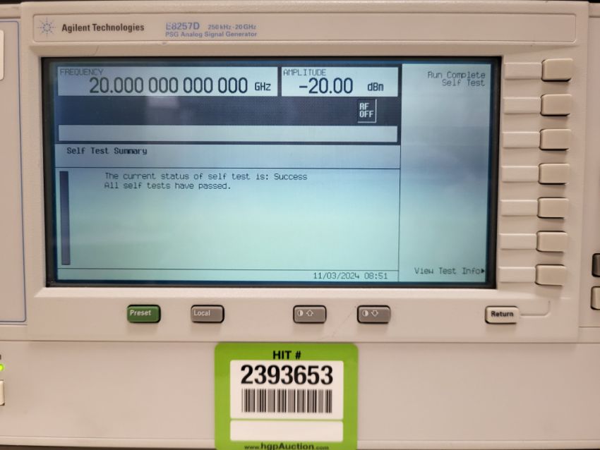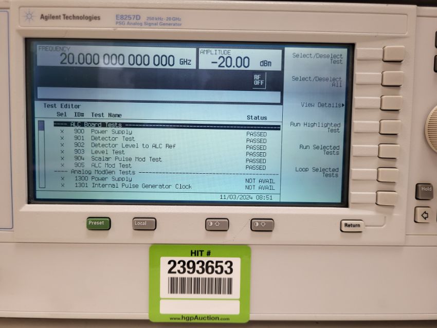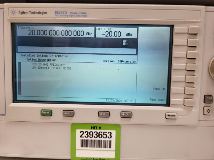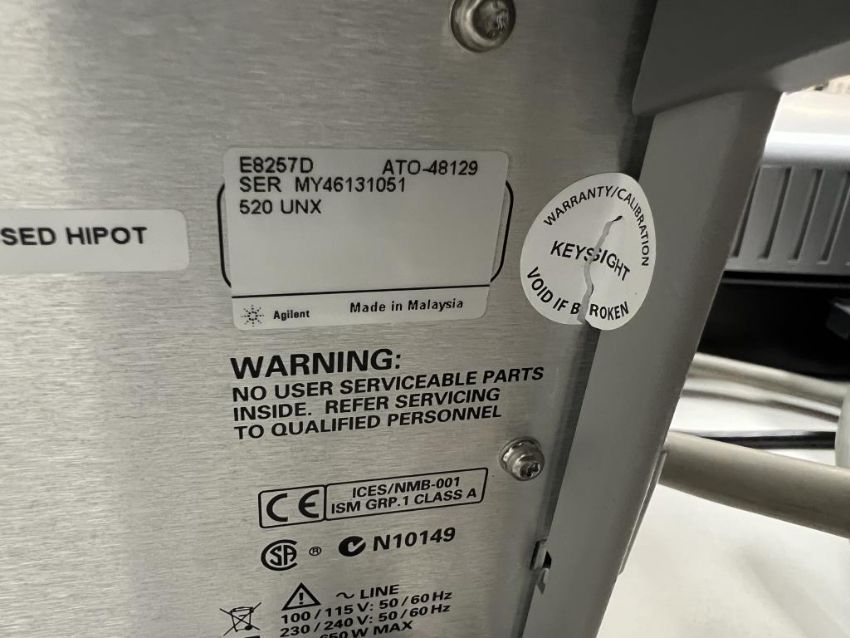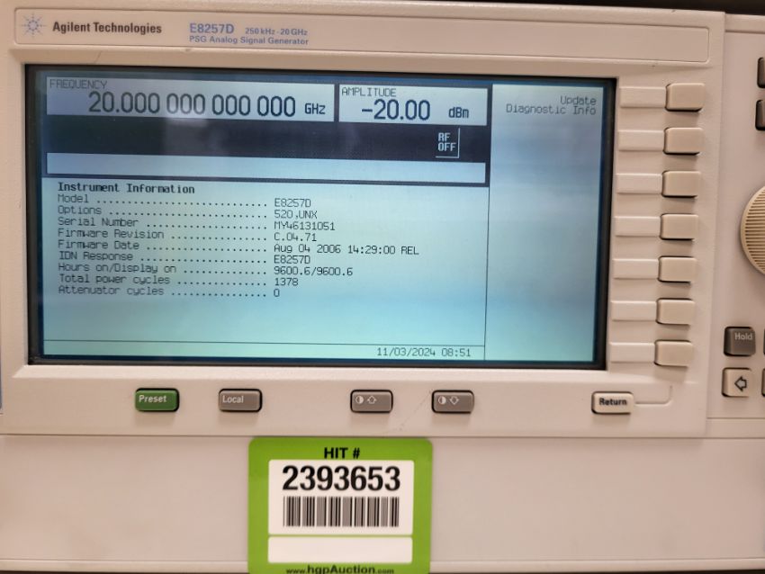 Agilent Technologies E8257D PSG Analog Signal Generator, 250 kHz-20 GHz with Options 520 UNX. S/n# MY46131051. HIT# 2393653. Loc: Lab. Asset Located at 300 Digital Dr, Morgan Hill, CA 95037.