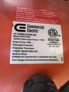 Commercial Electric HVFF16CE 16" Turbo Floor Fan. HIT #2476571. Asset Located at 84805 Ave 48, Coachella, CA 92236.