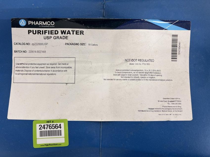 Pharmco ZP232000USP 55 Gallon Drum of Purified Water USP Grade. HIT #2476564. Asset Located at 84805 Ave 48, Coachella, CA 92236.