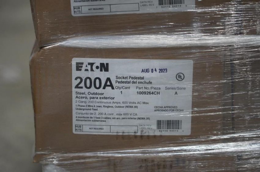 Eaton 1009264CH Lot of (12) 200 Amp Socket Pedestals, (1) Per Box, 2 Gang, 200 Continuous Amps, 600 Volts AC Max, 1 Phase, 3 Wire, 4 Jaws, Ringless, Outdoor (NEMA3R) Series A. HIT# 2354544. Asset Located at 6314 Eastwood Court, Mequon, WI 53092.