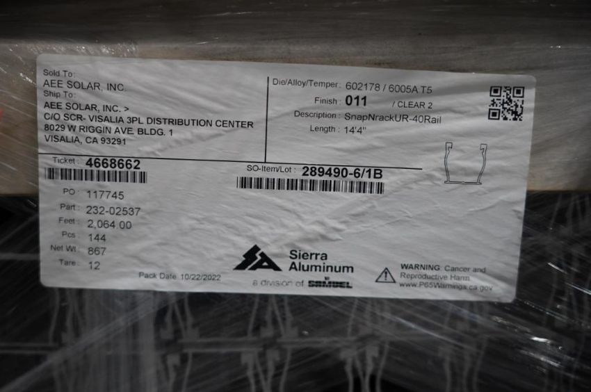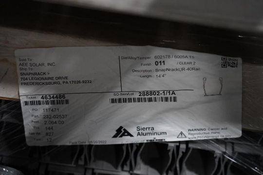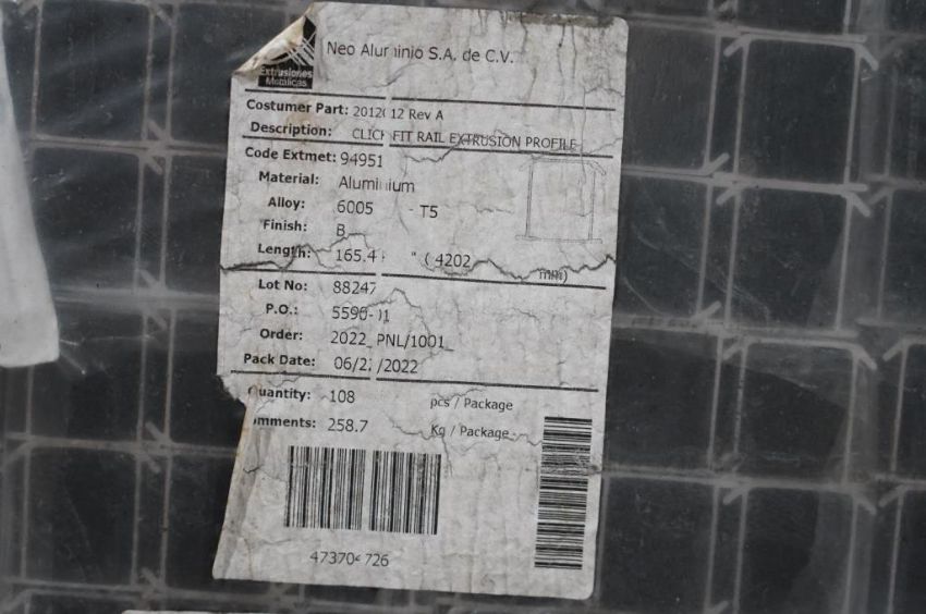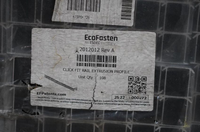 EcoFasten / SnapNrack Lot: (5 Total) Click Fit Rail Extrusion Profiles, EcoFasten Model 2012012 and SnapNrack. Aluminum, 108 Per Bundle, 165.4'' Long , (2) Bundles, Aluminum, (2) Bundles 144 Per Bundle, 2.064 total Ft'' Long , Silver (1) Half Bundle, 172'' Long Each pcs., Silver. HIT# 2354579. Asset Located at 6314 Eastwood Court, Mequon, WI 53092.