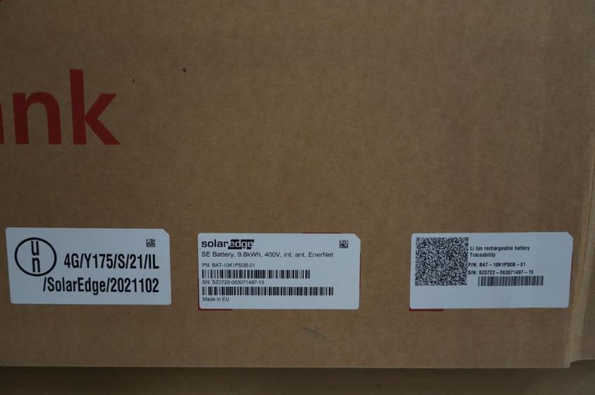 SolarEdge BAT-10K1PS0B-01 Energy Bank Battery, 9.8 kWh, 400 Volt, Int., Ant, EnerNet, Ion Rechargeable Battery , Wiring Trough. SN# SZ70722-063071497-15. HIT# 2354625. Asset Located at 9124 Grand Ave. S - Ste. 105, Bloomington, MN 55420.