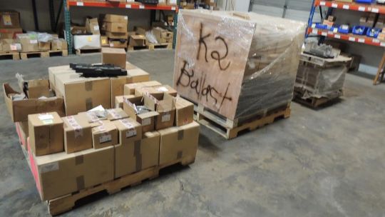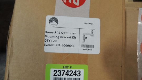Everest Solar Lot: (3) pallets and contents, Ballast, dome spacers, dome optimount, dome struts, dome porter 6874, Ballast mounts, other items included but not listed. Review photos for more information. HIT# 2374243. Warehouse. Asset Located at 1530 Goodyear Drive - Suite G, El Paso, TX 79936.