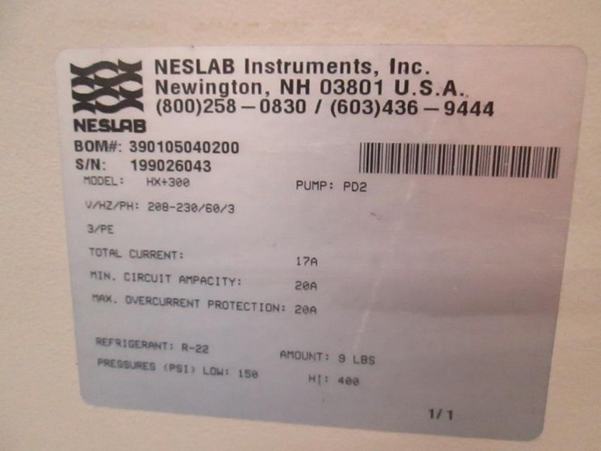Neslab HX300 Recirculating Chiller, 208-230v, 3PHASE, 60Hz, 17A Current, Min Circuit ampacity 20A, Refrigerant R-22. SN# 199026043. HIT# 2429515. Asset Located at 4100 N Powerline Road Suite H5, Pompano Beach, FL 33064.
