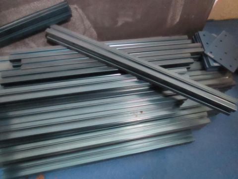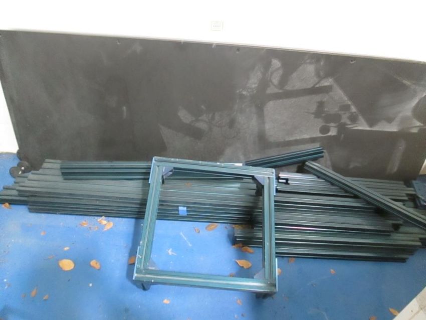 Lot of Frame Construction Materials, Includes 84" and 28" Aluminum Frame Pieces, (3) 87" x30" Tabletops and 12 Corner Plates. Enough for (3) Full Tables, also includes 1 Constructed Frame, 28" x 28". HIT# 2429519. Asset Located at 4100 N Powerline Road Suite H5, Pompano Beach, FL 33064.