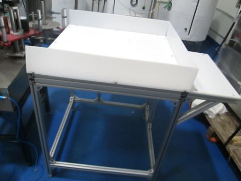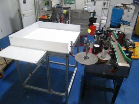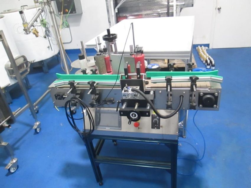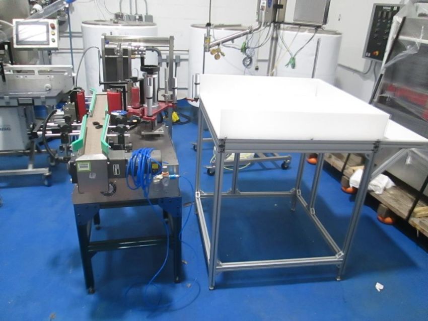 Custom Automatic Bottle Labelling System Including 52" x 6" Belt Conveyor with adjustable plastic guards, includes Samkoon Digital Interface. Dimensions:52" x 44" x 58", with Feed Table. Dimensions: 50" x 48" x 48". HIT# 2429506. Asset Located at 4100 N Powerline Road Suite H5, Pompano Beach, FL 33064.