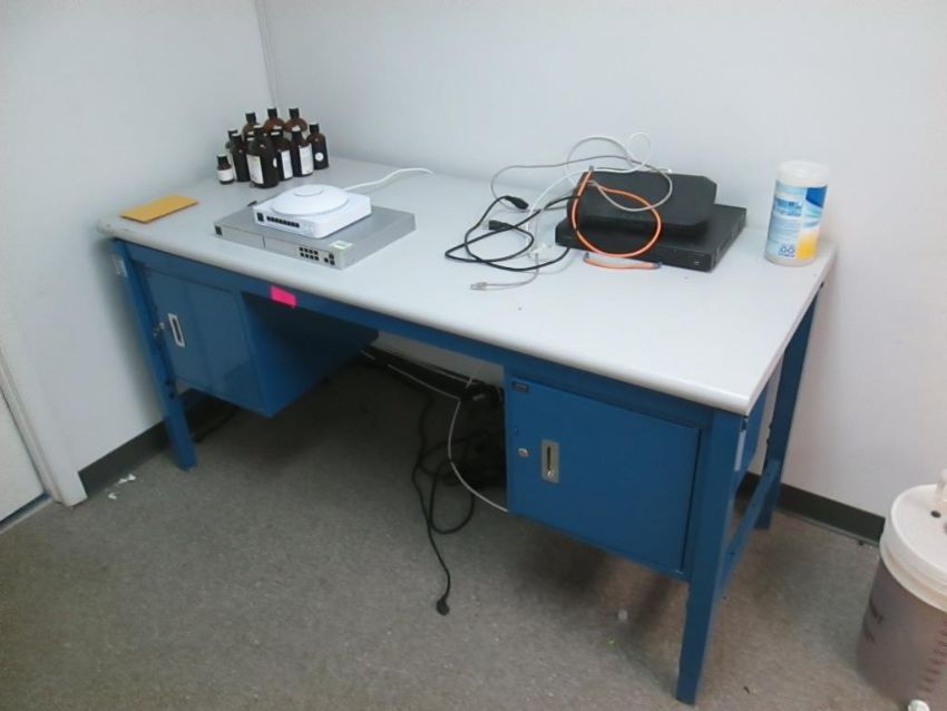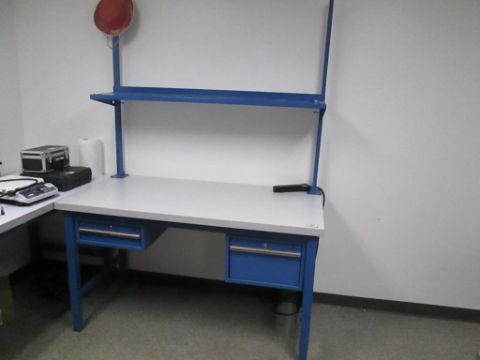 Lot of (4) Lab Workstations with Undermounted Drawers Consisting of: (2) Workstations with Screw Mounted Shelving (Desk Dimensions 30" x60" x34" total height: 83") and (2) without Shelving (Dimensions 72" x 30" x 34"). HIT# 2429541. Asset Located at 4100 N Powerline Road Suite H5, Pompano Beach, FL 33064.