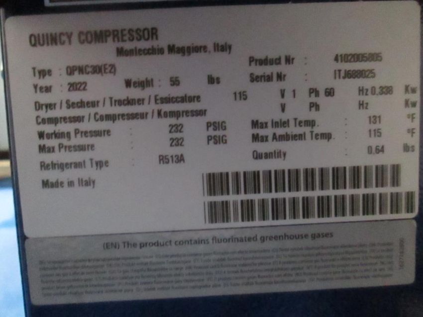 Quincy QPNC30(E2) Non-Cycling Air Dryer, Mfg. Year 2022, 115V, 1PHASE, Working Pressure 232 PSIG. SN# ITJ688025. HIT# 2429513. Asset Located at 4100 N Powerline Road Suite H5, Pompano Beach, FL 33064.