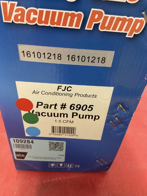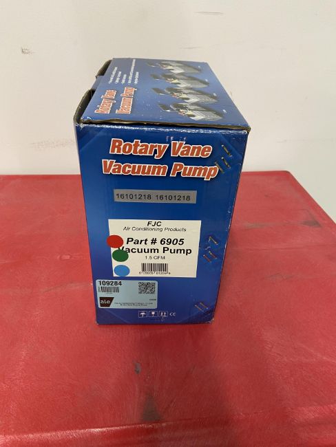 FJC Air Conditioning Products Part# 6905 Vacuum Pump. S/N: 16101218. Loc: Cart 2. Asset Located at 100 Cummings Center #150B, Beverly, MA 01915.