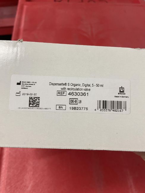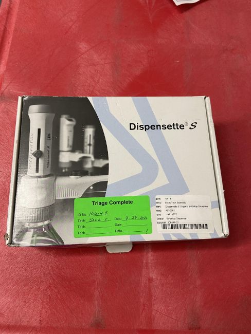 BrandTech Scientific Dispensette S Organic 4630361 Bottle Top Dispenser. S/N: 19B23775. Loc: K31b. Asset Located at 100 Cummings Center #150B, Beverly, MA 01915.