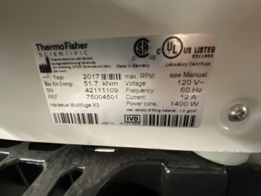 Thermo Fisher Scientific Multifuge X3 75004501 Centrifuge. S/N: 42111109. Loc: K31b. Asset Located at 100 Cummings Center #150B, Beverly, MA 01915.