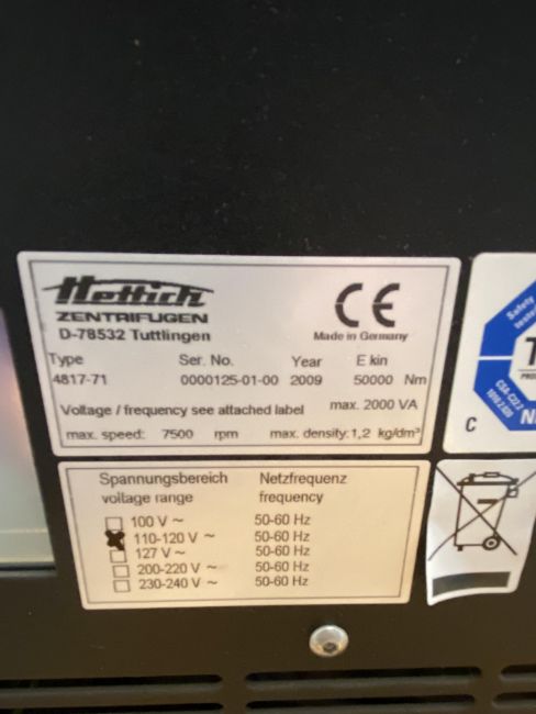 Hettich Rotanta 46RSC 4817-71 Centrifuge. S/N: 0000125-01-00. Loc: M21a. Asset Located at 100 Cummings Center #150B, Beverly, MA 01915.