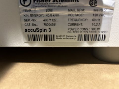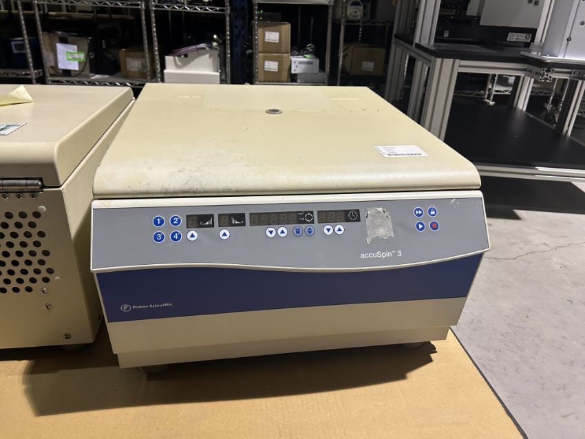 Fisher Scientific accuSpin 3 Centrifuge. S/N: 40871127. Loc: B-2-2c. Asset Located at 100 Cummings Center #150B, Beverly, MA 01915.