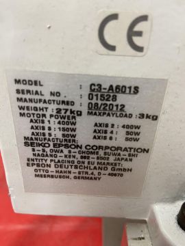 Seiko Epson ProSix C3-A601S Robotic Arm. S/N: 01528. Loc: Pallet 31. Asset Located at 100 Cummings Center #150B, Beverly, MA 01915.