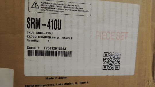 Echo Model SRM-41OU Power head only, gas powered 42.7cc trimmer w/U handle, UNUSED IN SEALED CARTON. SN# T75412015263. HIT# 2374675. Shop Area. Asset Located at 16331 Pleasantville Rd., San Antonio, TX 78233.