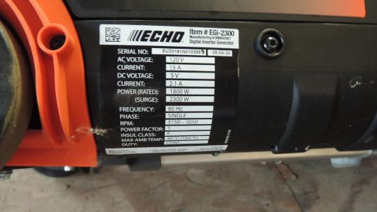 Echo Model EG-2300 Gas powered 80cc, Digital inverter generator, Blue tooth wireless technology, 120V, 1800 W, Yr. 2020, UNUSED. SN# EU20191N010395. HIT# 2374658. Shop Area. Asset Located at 16331 Pleasantville Rd., San Antonio, TX 78233.