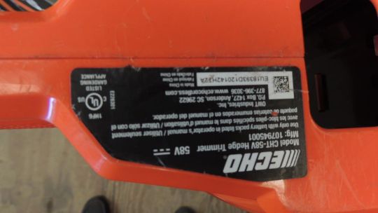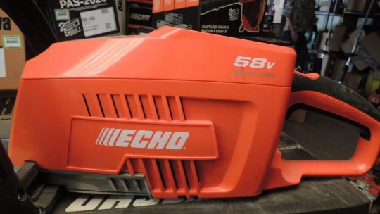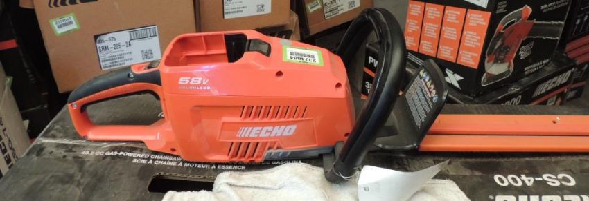 Echo Model CHT-58V Battery powered 58V hedge trimmer, w/ battery and charger, UNUSED. SN# EU18393D120142HT2A. HIT# 2374684. Shop Area. Asset Located at 16331 Pleasantville Rd., San Antonio, TX 78233.