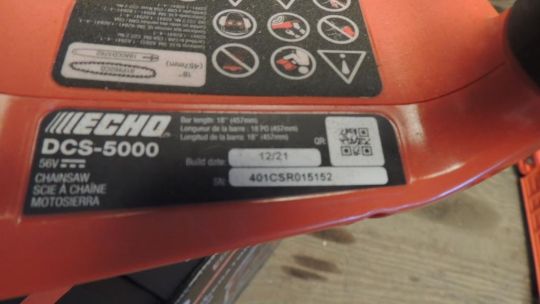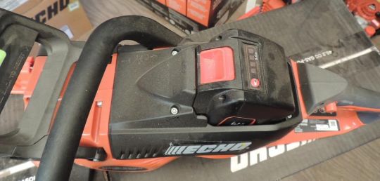 Echo Model DCS-5000 Battery powered top hand chainsaw 18" w/ bar and chain, eFORCE 56V battery system w/ battery and charger, Yr. 2021, UNUSED. SN# 401CSR015152. HIT# 2374682. Shop Area. Asset Located at 16331 Pleasantville Rd., San Antonio, TX 78233.