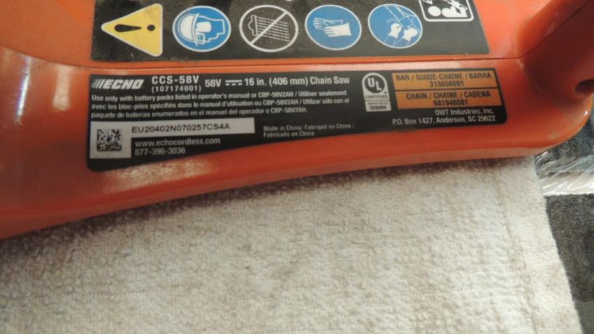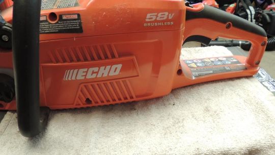 Echo Model CCS-58V Cordless 58V Lithium battery and charger included, 16" bar and chain, UNUSED. SN# EU204002N070257CS4A. HIT# 2374704. Shop Area. Asset Located at 16331 Pleasantville Rd., San Antonio, TX 78233.