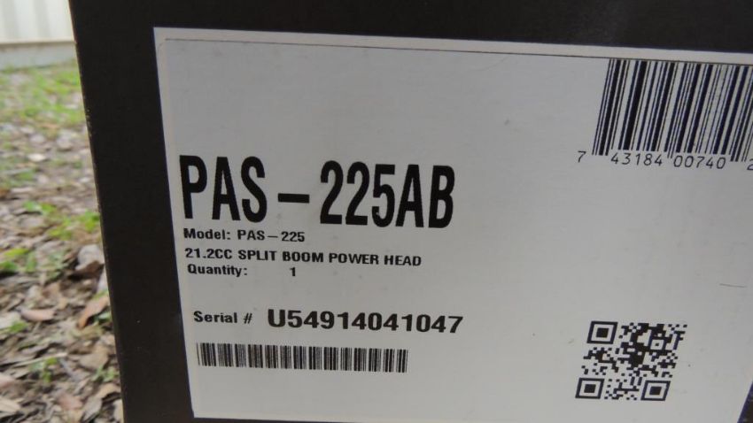 Echo Model PAS-225AB (Unused) Power Head. Pro attachment series, gas engine 21.2cc, split power boom head. SN# U54914041047. HIT# 2374358. Outside in Container. Asset Located at 5515 N US Hwy 281, Marble Falls, TX 78654.