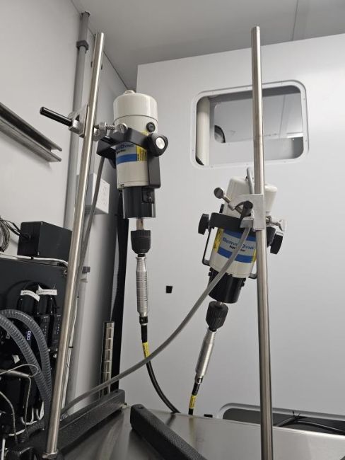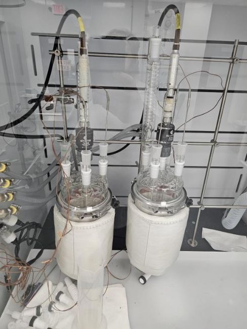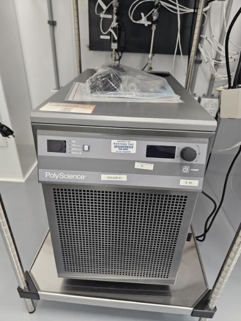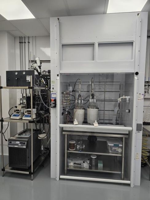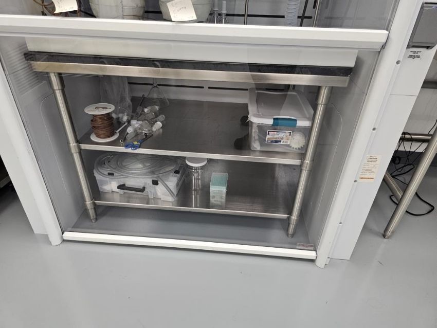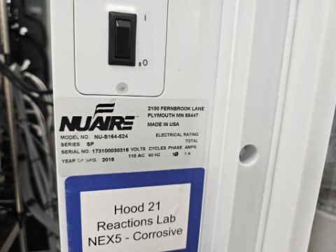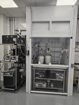 Custom Reaction Lab Complete With (1) Nuaire Model NU-S164-524 Series SP Poly Laminar Flow Enclosure With Double Sashes, (2) Chemglass Reaction Vessels with Mantles and Thermocouple Controls, (2) Cole Parmer Servo Dyne Series Digital Mixing Heads Model 50008-20 w/ ServoDyne Controllers and Caframo Model 04552-80 Stands, (2) Omega 8-Channel Thermocouple Temperature Recorders, (1) PolyScience Model 6561M11A1Y3C Recirculating Chiller, sn 1906-90021. HIT# 2495127. Asset Located at 25 Olympia Ave. Suite B, Woburn, MA 01801.