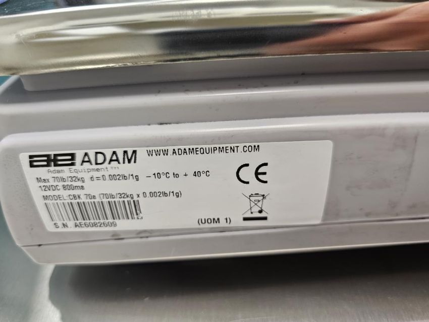 Adam Model CBK70A 70lb/32kg d=0.002lb/1g Benchtop Lab Scale, sn AE6082609. HIT# 2495117. Asset Located at 25 Olympia Ave. Suite B, Woburn, MA 01801.
