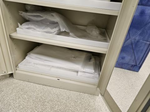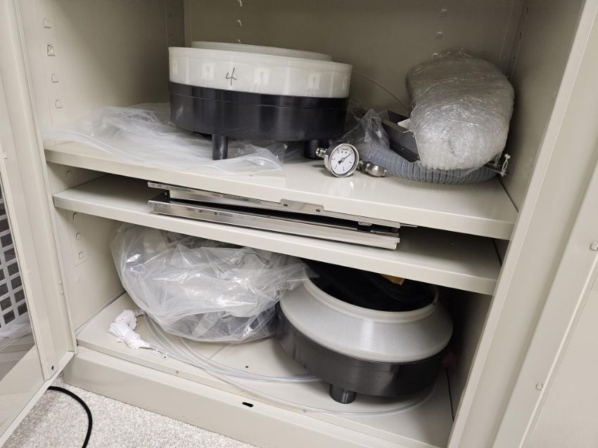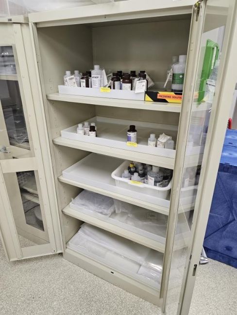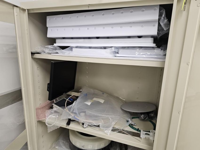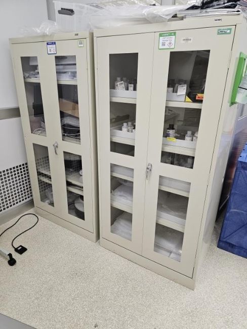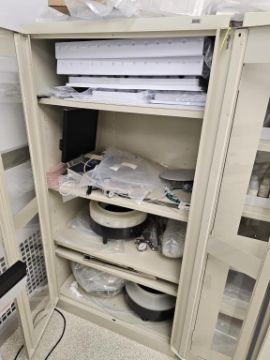Lot of (2) Uline 2-Door Storage Cabinets With Parts for Coater/Developer. Note: Liquids Not Included. HIT# 2495065. Asset Located at 25 Olympia Ave. Suite B, Woburn, MA 01801.
