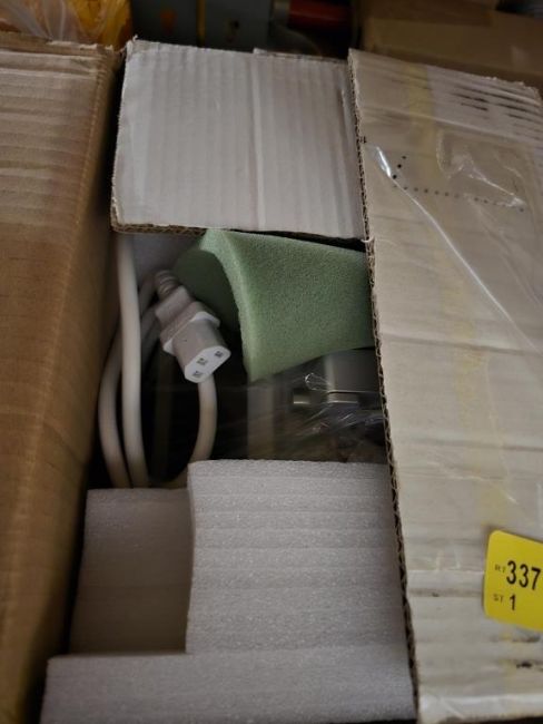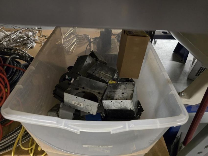 Lot of (4) Shelving Units and Contents - Building Materials and Support, Including Wires, Electrical Boxes, 24" x 48" Ceiling Tiles, Simco Ionization Bar, Hitachi Rotor and More. See Photos. HIT# 2495327. Asset Located at 25 Olympia Ave. Suite B, Woburn, MA 01801.