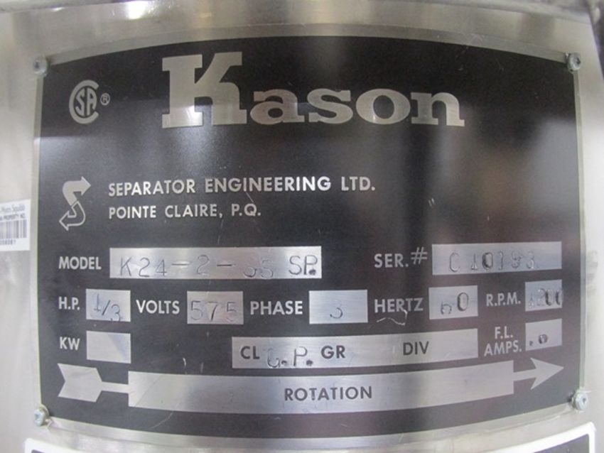 24" Kason screen, Model K24-2-SSSP, Stainless Steel construction including stand and base, two deck design, on base with .33 hp, 575 volt motor, serial# C10193. FEC# 2855-11. Asset Located in Cleveland, OH 44127. ***Auctioneer Notice*** Please be advised a handling fee of $100 will apply to the purchase of this lot. This fee is for off-loading of all items in this lot to the dock area for pickup. Buyer is responsible for transport - the fee does not include charges associated with packing and shipping.