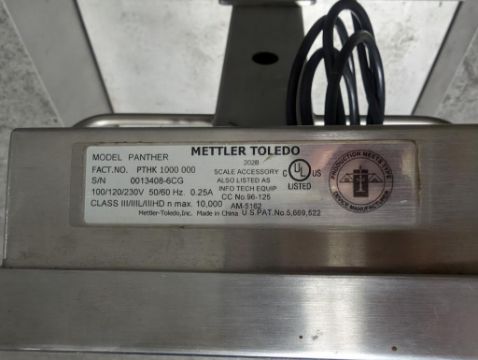 Mettler Toledo Panther Floor scale , fact# PTHK 1000 00. SN# 0013408-6CG. FEC# 4546-8. Asset Located in Cleveland, OH 44127. ***Auctioneer Notice*** Please be advised a handling fee of $100 will apply to the purchase of this lot. This fee is for off-loading of all items in this lot to the dock area for pickup. Buyer is responsible for transport - the fee does not include charges associated with packing and shipping.