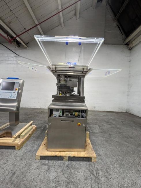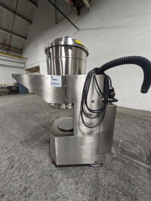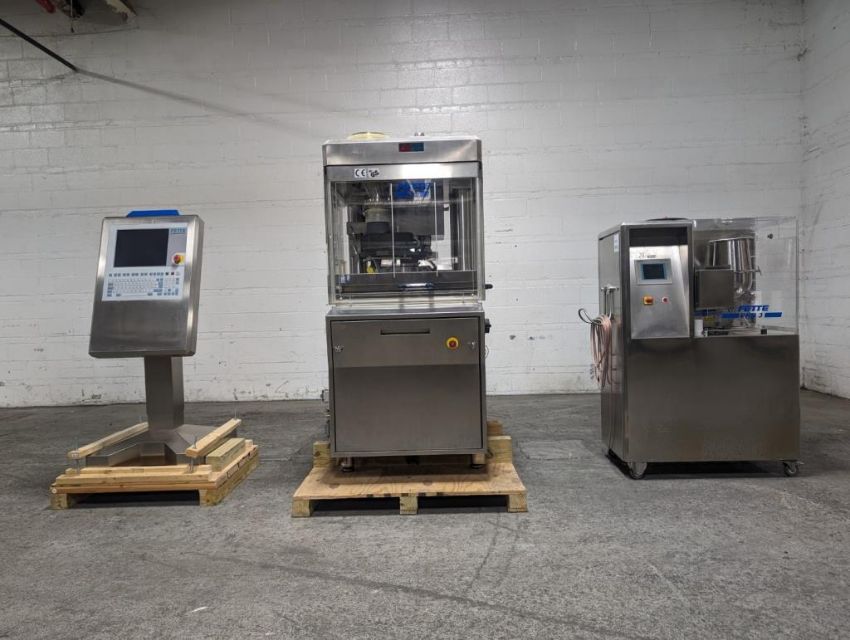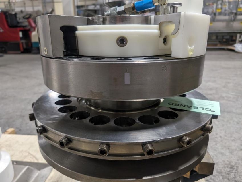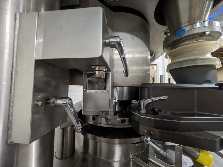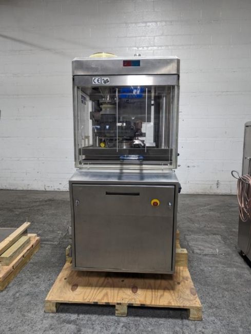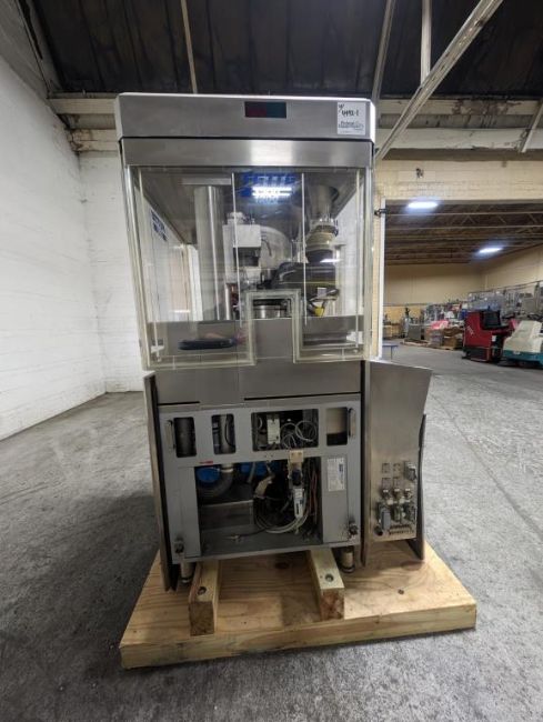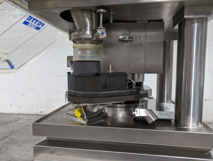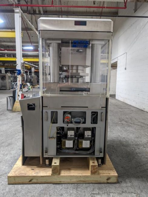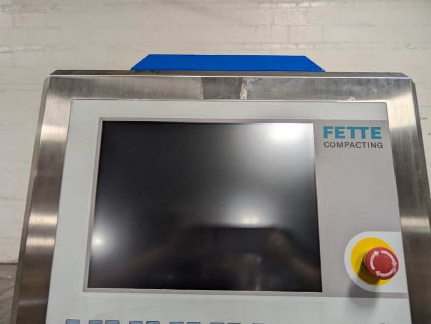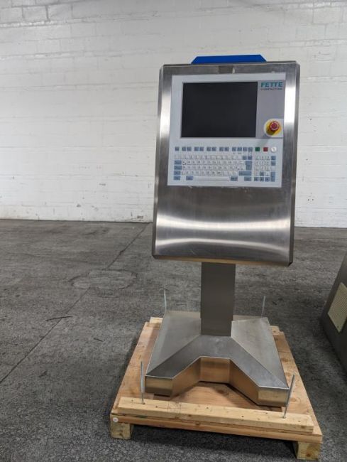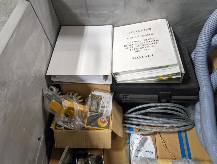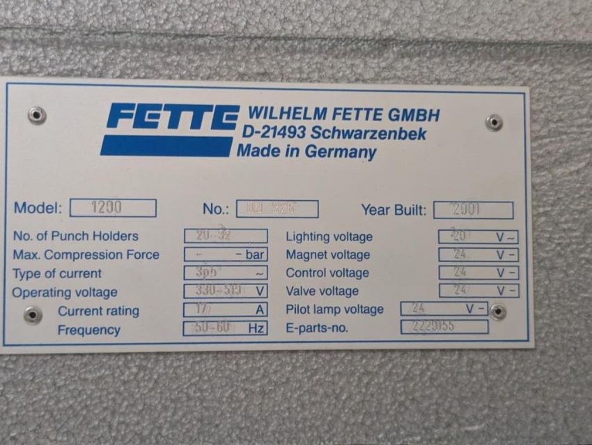 Fette rotary tablet press, Model 1200, with 24 station B tooled (installed) and 20 station D tooled turrets, keyed upper punch guides, 80kN main compression, 80kN precompression, single sided, force feeder with hopper, 18 mm max diameter, 20 mm max depth of fill for B tooled turret, 25 mm max diameter, 22 mm max depth of fill D tooled turret, speeds up to 172800 tablets/hour B tooled, 120,000 tablets/hour D tooled, includes Fette PKB 3 press tooling lubrication system, CFM 3306 dust vacuum system, Fette serial# 09 326, built 2001. FEC# 4492-1. Asset Located in Cleveland, OH 44127. ***Auctioneer Notice*** Please be advised a handling fee of $100 will apply to the purchase of this lot. This fee is for off-loading of all items in this lot to the dock area for pickup. Buyer is responsible for transport - the fee does not include charges associated with packing and shipping.