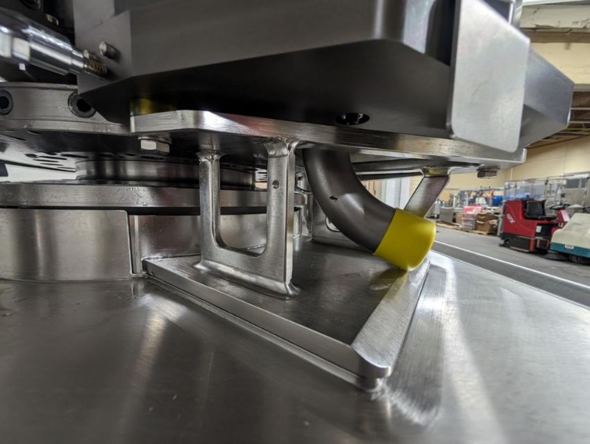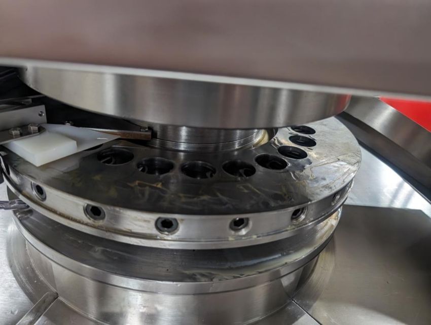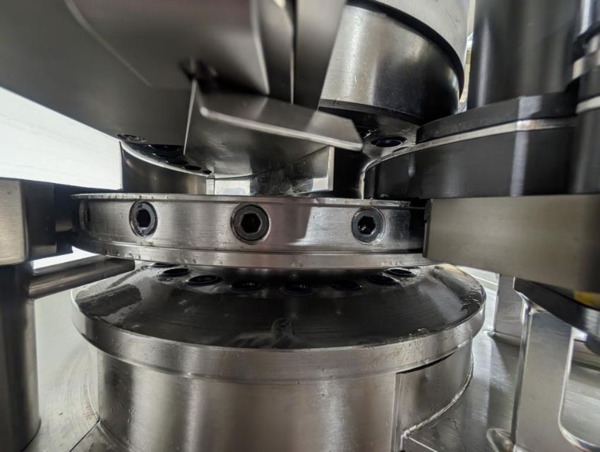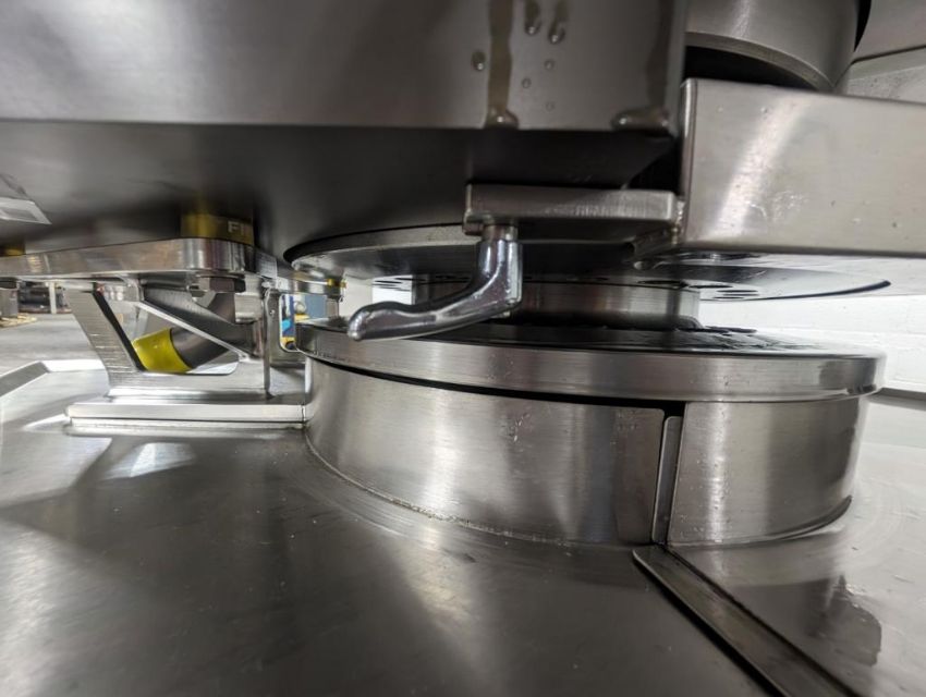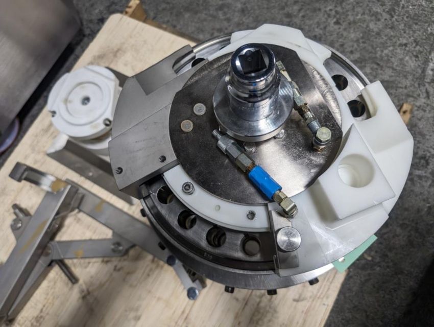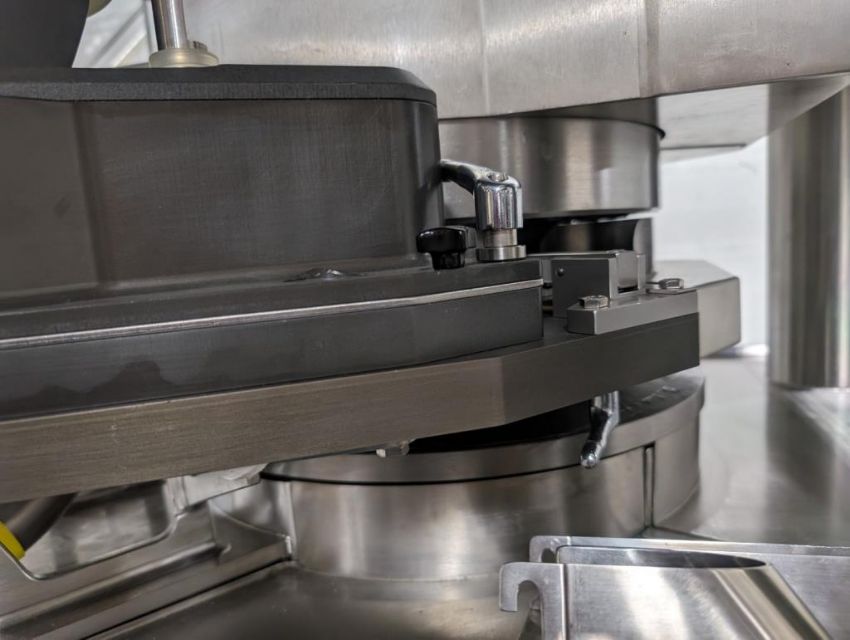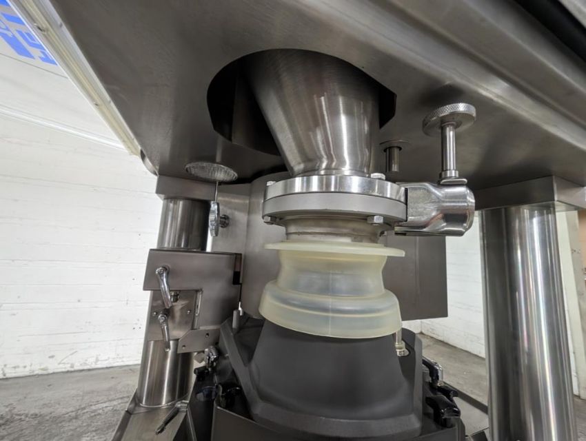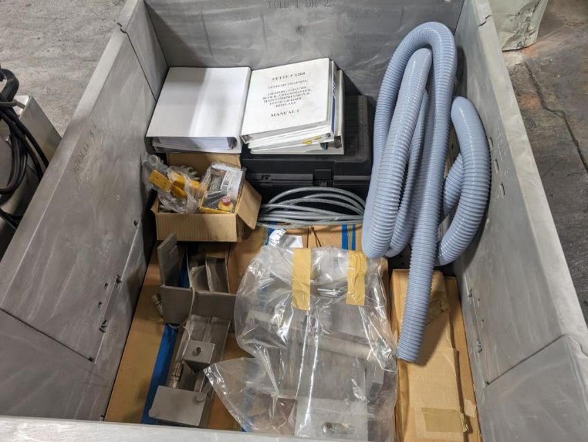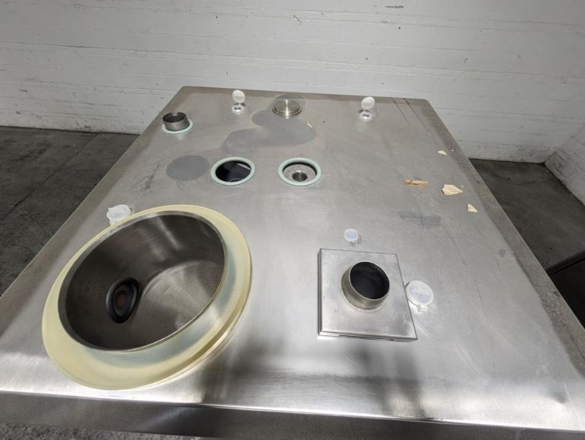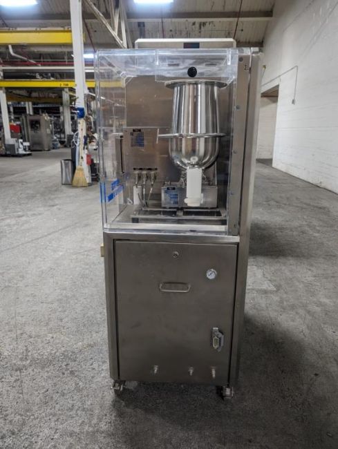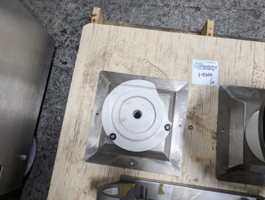 Fette rotary tablet press, Model 1200, with 24 station B tooled (installed) and 20 station D tooled turrets, keyed upper punch guides, 80kN main compression, 80kN precompression, single sided, force feeder with hopper, 18 mm max diameter, 20 mm max depth of fill for B tooled turret, 25 mm max diameter, 22 mm max depth of fill D tooled turret, speeds up to 172800 tablets/hour B tooled, 120,000 tablets/hour D tooled, includes Fette PKB 3 press tooling lubrication system, CFM 3306 dust vacuum system, Fette serial# 09 326, built 2001. FEC# 4492-1. Asset Located in Cleveland, OH 44127. ***Auctioneer Notice*** Please be advised a handling fee of $100 will apply to the purchase of this lot. This fee is for off-loading of all items in this lot to the dock area for pickup. Buyer is responsible for transport - the fee does not include charges associated with packing and shipping.