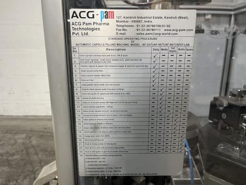 ACG-Pam AFT LAB capsule filler, serial number 068, with speeds up to 25,000 capsules per hour. Capable of filling powders, pellets, tablets, micro tablets, capsules, soft gels, and their combinations in capsules. FEC# 4275-20. Asset Located in Cleveland, OH 44127. ***Auctioneer Notice*** Please be advised a handling fee of $100 will apply to the purchase of this lot. This fee is for off-loading of all items in this lot to the dock area for pickup. Buyer is responsible for transport - the fee does not include charges associated with packing and shipping.