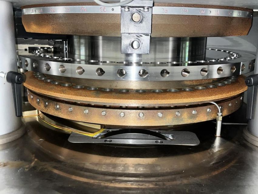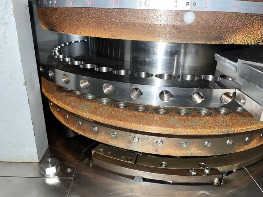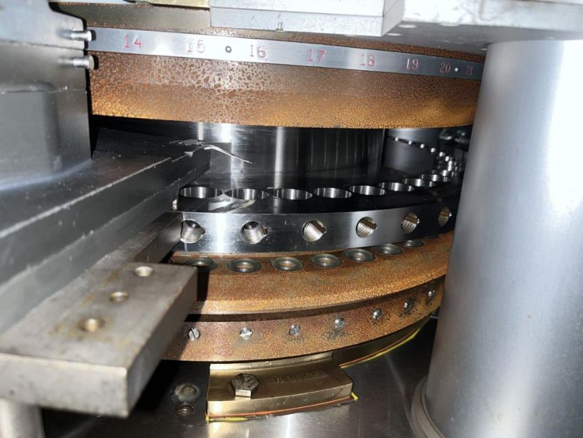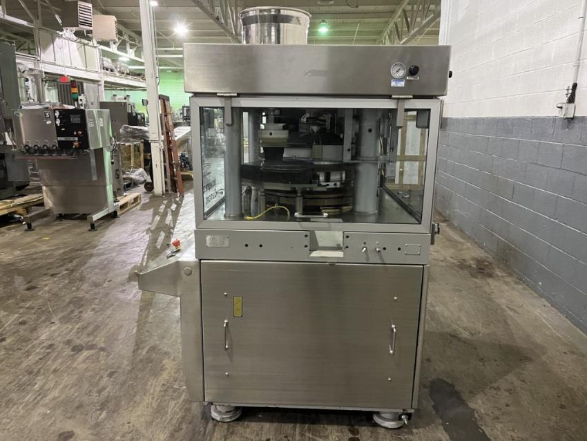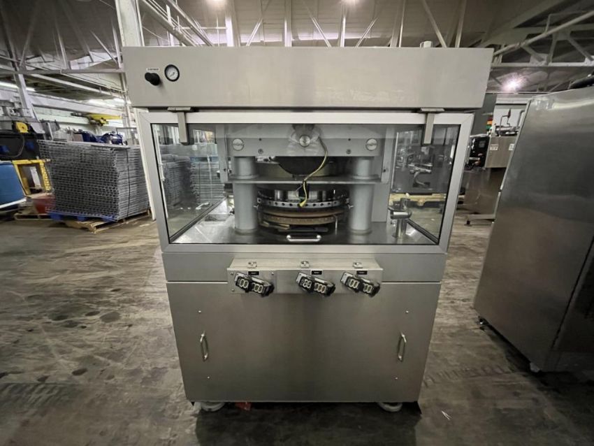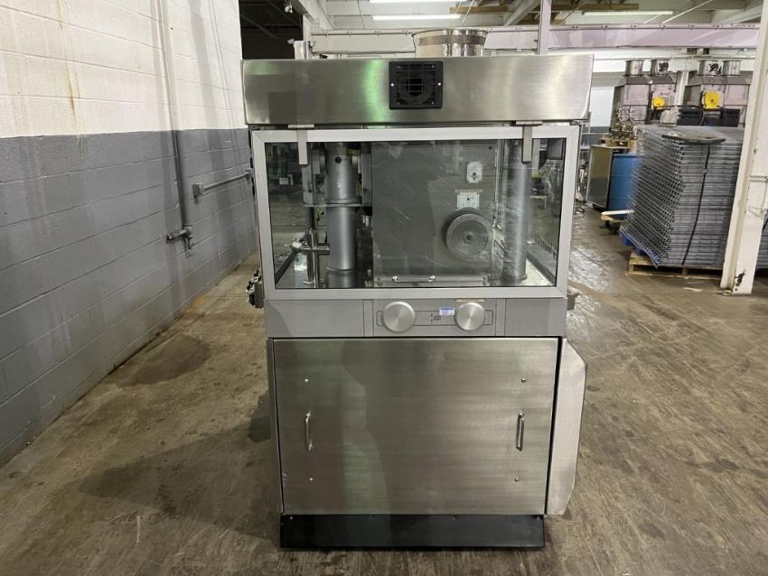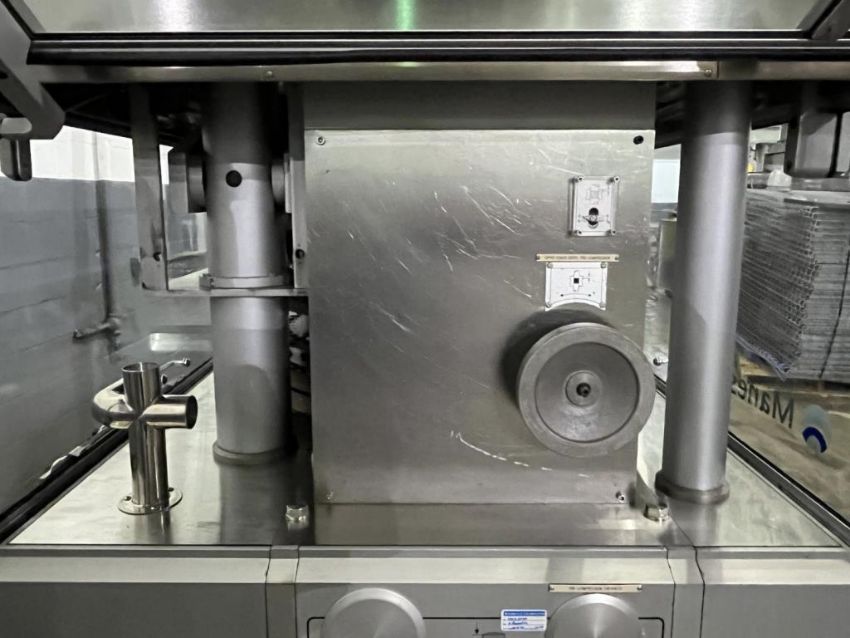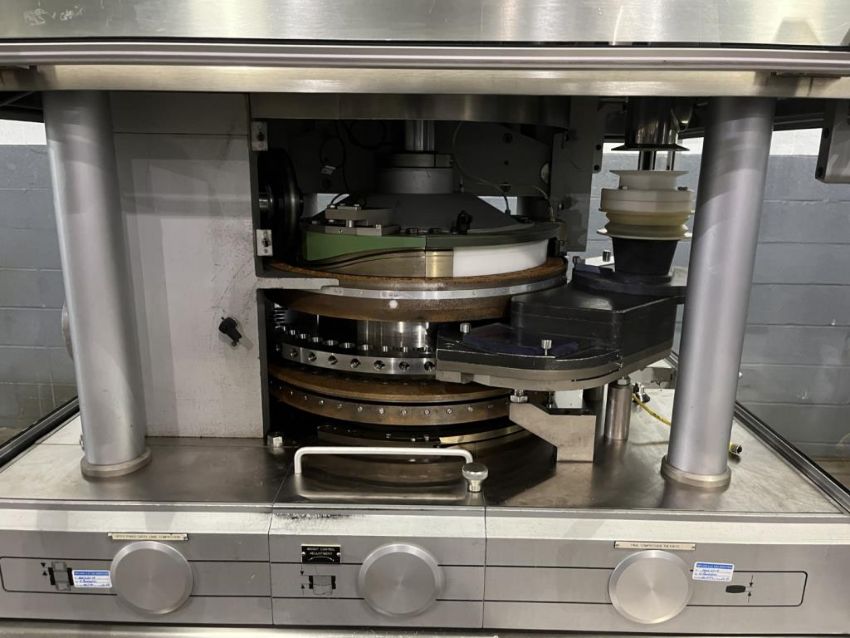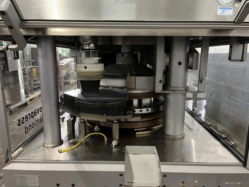 Manesty rotary tablet press, type Diamond Novapress, 51 station, 16 mm max tablet diameter, 17.46 max depth for fill, keyed upper punch guides, 6.5 ton compression pressure, 1 ton pre compression, single sided with force feeder, rated up 306,000 tablets/hour, refurbished by IPR, in 2017, serial# NOV46JB. FEC# 3777-4. Asset Located in Cleveland, OH 44127. ***Auctioneer Notice*** Please be advised a handling fee of $100 will apply to the purchase of this lot. This fee is for off-loading of all items in this lot to the dock area for pickup. Buyer is responsible for transport - the fee does not include charges associated with packing and shipping.