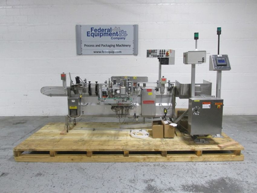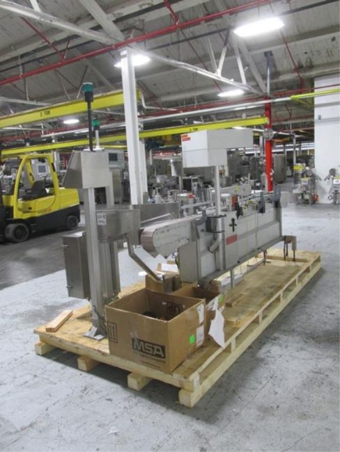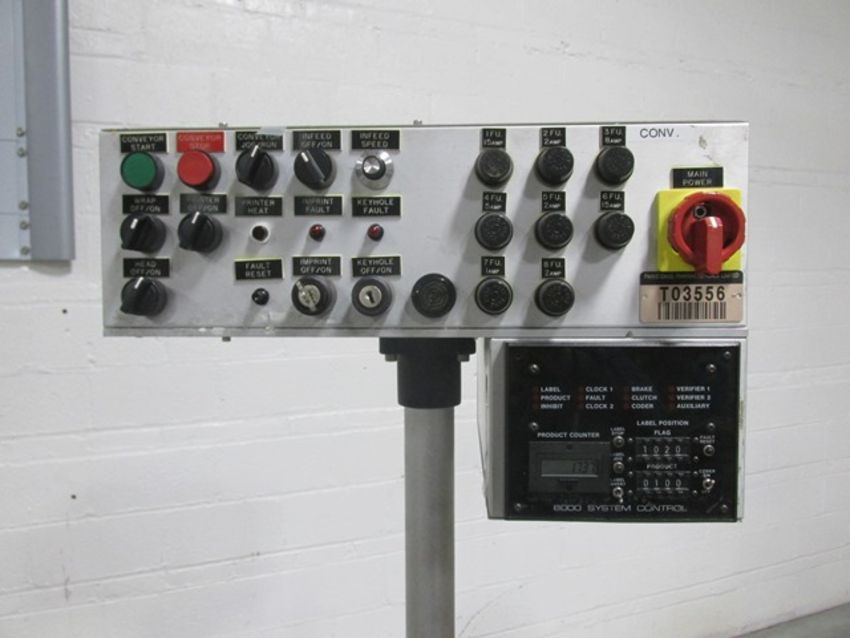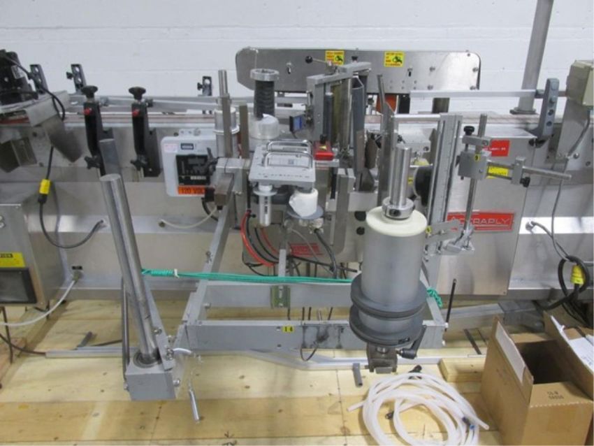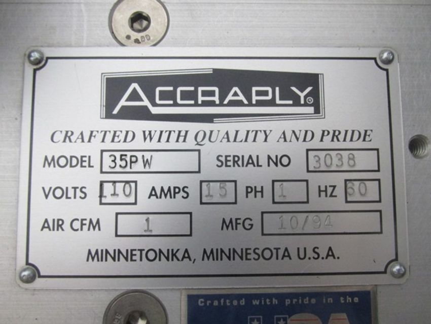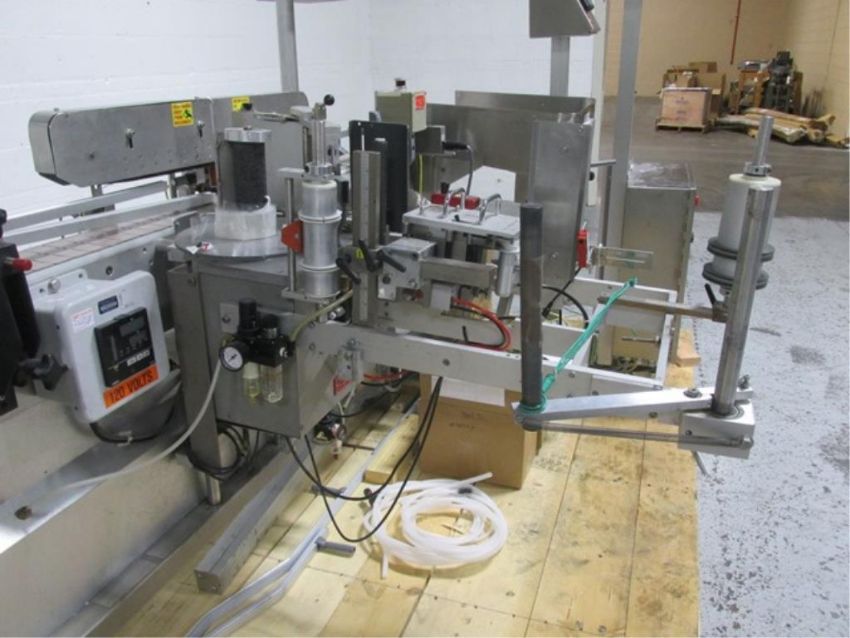 Accraply wrap-around labeler, Model 35PW, Open Date 1000 coder, top bottle hold down, Laetus Argus vision system, Allen-Bradley touchscreen controls, with assorted spare parts, 110 volts, serial# 3038, built 10/1994. FEC# 2706-3. Asset Located in Cleveland, OH 44127. ***Auctioneer Notice*** Please be advised a handling fee of $200 will apply to the purchase of this lot. This fee is for off-loading of all items in this lot to the dock area for pickup. Buyer is responsible for transport - the fee does not include charges associated with packing and shipping.
