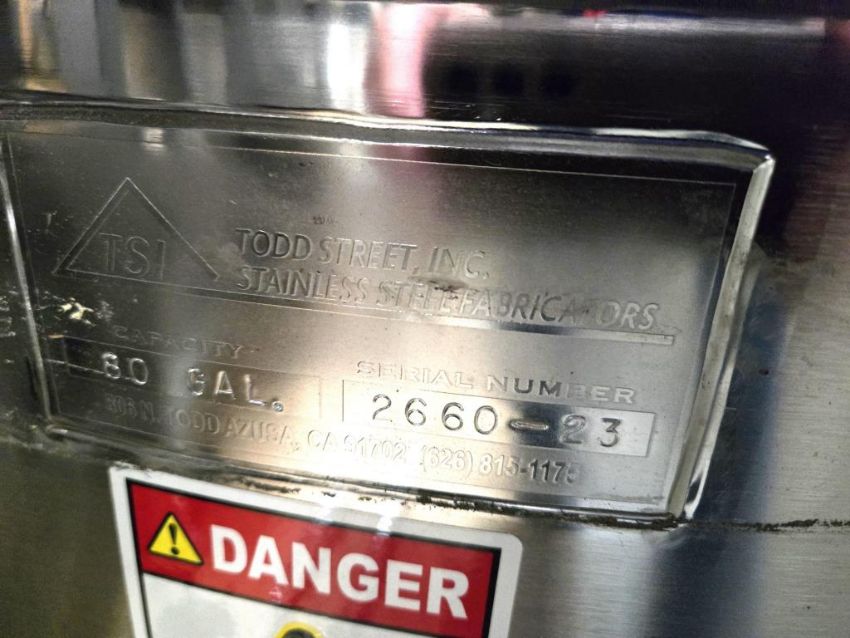 TSI SS Mixing Tank/Vessel, Capacity 60 Gallons. *** Auctioneer Notice*** Lot will be available for removal January 6 thru January 17, 2025. SN# 2660-23. HIT# 2452346. Section 1. Asset Located at 11840 S Alameda St., Lynwood, CA 90059.