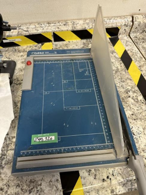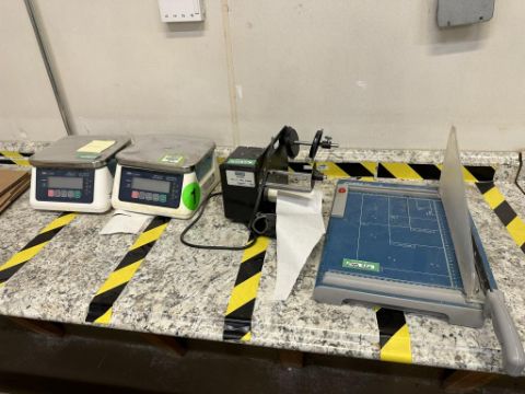 Lot to Include: (1) Dahle Paper Cutter, (1) Uline H-1276 Automatic Label Dispenser, and (2) A&D SJ-6000WP Bench Scales, NOTE: (1) Shown as Non-Working. HIT# 2498320. Loc: Long Hallway Room. Asset Located at 250 Hillside Blvd., South San Francisco, CA 94080.