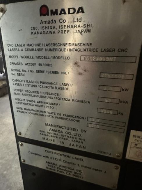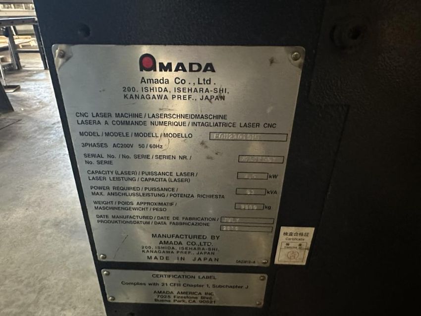 Amada FOM23015NT Fanuc AF4000i-B, 4000 W Laser, Table Working Range X x Y Axis=3420 x 1550 mm, Amada Controller, Amada LST-30 Shuttle Table, Orion Chiller and Torit Model ADFO2-8 Dust Collector, (2010). S/n#47511951. HIT# 2498507. Asset Located at 1502 14th St. NW, Auburn, WA 98001.